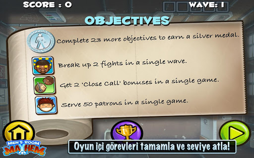 İlerledikçe yönetmen gereken 5 farklı konum olacak. Belirli oyun için görevleri yaparak yeni öğeler açıp seviye atla. Dikkatli ol! Müşteri dalgaları artacağından her seviyede işin zorlaşacaktır! Yaşlı ve sarhoş müşterilerin yan yana gelemeyeceğini unutma! Yani kendini ağır ve tez kanlı kişilere karşı hazırla! Müşteri akışını yönetip onları kazasız içeri ve dışarı taşıyabilir misin? Yoksa zamanında görevini başaramayıp pis bir tuvalete neden olan kötü bir hademe misin?